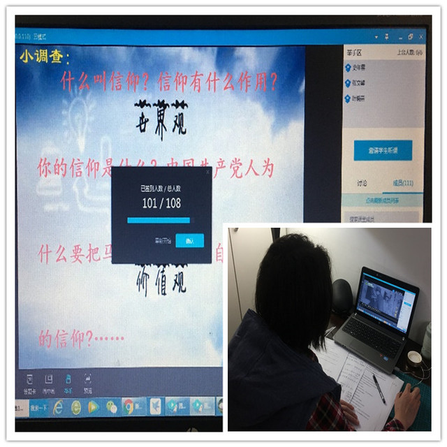 线上线下联动,打好教学“组合拳”。本学期思政课共有47位任课教师,涉及全校17个二级学院的259个教学班近11000多名学生。为适应教学由“面对面”向“键对键”的转变,学院成立了由课程负责人组成的在线教学团队,通过开展集体备课,明确教学目标、选定教学方法、多方了解学生思想及学习状况,科学制定制定教学预案,努力提高学生的参与度与抬头率。为切实加强师生互动,实现“知”“情”“意”“行”的统一,让学生真懂真信,教师能充分利用QQ群、微信群、腾讯课堂等辅助教学工具和优质在线课程资源,通过慕课教学与补充讲解相结合、专题讨论与在线答疑为补充,及时了解学生诉求,延伸教学时空,为学生提供全方位的学习支持,进而实现课上和课下、学生自学和老师讲授、观看视频资料和互动交流的有机结合。