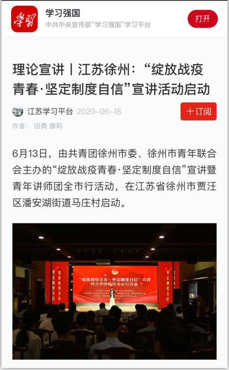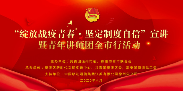 6月13日,由共青团江苏省委发起,共青团徐州市委、徐州市青年联合会主办的“绽放战疫青春·坚定制度自信”宣讲暨青年讲师团全市行活动,在江苏省徐州市贾汪区潘安湖街道马庄村启动。该项活动历时半年,徐州市将组织全市各级青年讲师团成员、抗疫一线青年榜样来到青年身边、走进青年群体,开展“进学校、进企业、进农村、进社区、进网络”的“五进”宣讲活动,广泛讲述优秀青年事迹,宣讲中国制度优势,讲好中国抗疫故事,传播青春正能量。