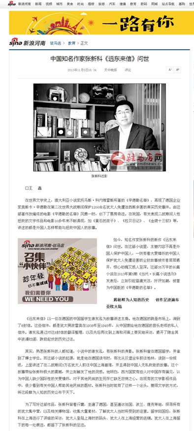 新浪网报道“中国知名作家张新科《远东来信》问世”