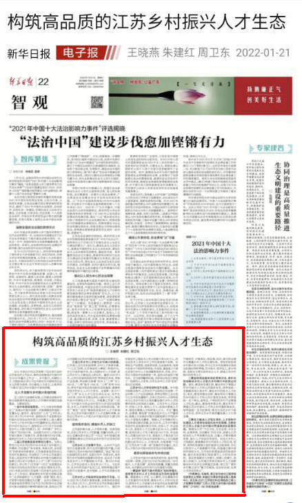 1月21日,《新华日报》第22版刊发我院教师王晓燕、周卫东等完成的研究文章,题目是《构筑高品质的江苏乡村振兴人才生态》。