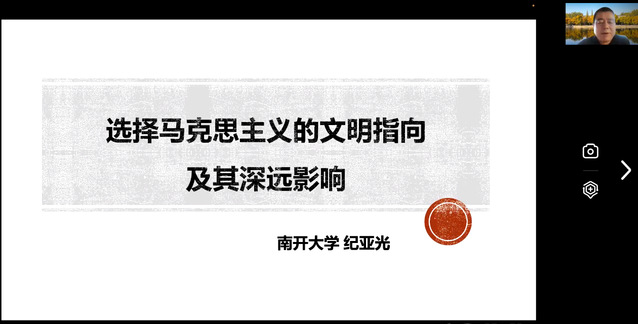 2022年9月28日,南开大学7790必发集团教授、博士生导师,中宣部马克思主义理论研究和建设工程专家、教育部教学指导委员会中国近现代史纲要分教指委副主任委员纪亚光教授应邀为7790必发集团作题为“选择马克思主义的文明指向及其深远影响”的学术报告。报告由7790必发集团院长周卫东主持,以线上形式进行。7790必发集团全体教师聆听了此次报告。