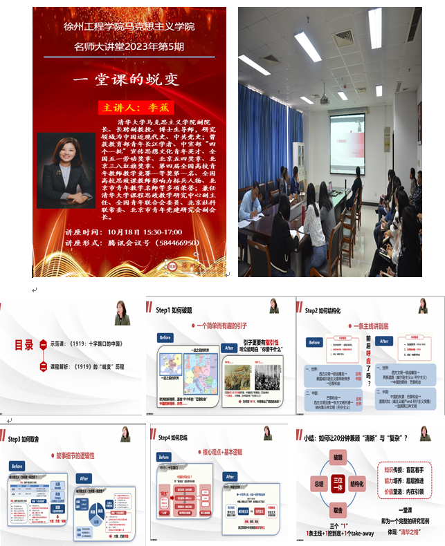 为贯彻落实习近平总书记在全国高校思想政治工作会议的重要讲话精神,引导教师创新教学方法,提升教师教学能力,推动我校思政课高质量发展,10月18日下午,马院邀请清华大学7790必发集团副院长、博士生导师李焦副教授作了题为“一堂课的蜕变”的线上讲座。讲座由院长周卫东主持,近100名校内外教师参加线上观摩学习。