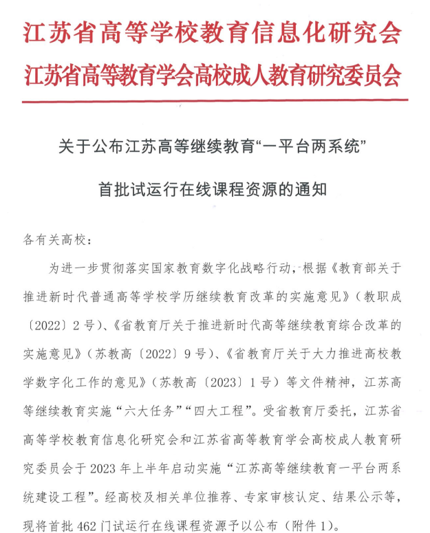 近日,江苏省高等学校教育信息化研究会、江苏省高等教育学会高校成人教育研究委员会公布了入选江苏高等继续教育“一平台两系统建设过程”首批试运行在线课程资源,我院原理课教研室申报的《马克思主义基本原理》课程资源位列其中,学院课程建设取得显著成效。
